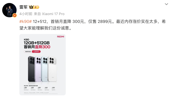 卢伟冰提到,不少用户对此表达了些许失望。经过内部讨论,小米决定K90标准版12GB+512GB版本首销月内直降300元,价格调整为2899元。12GB+512GB是小米用户关注度较高的版本。