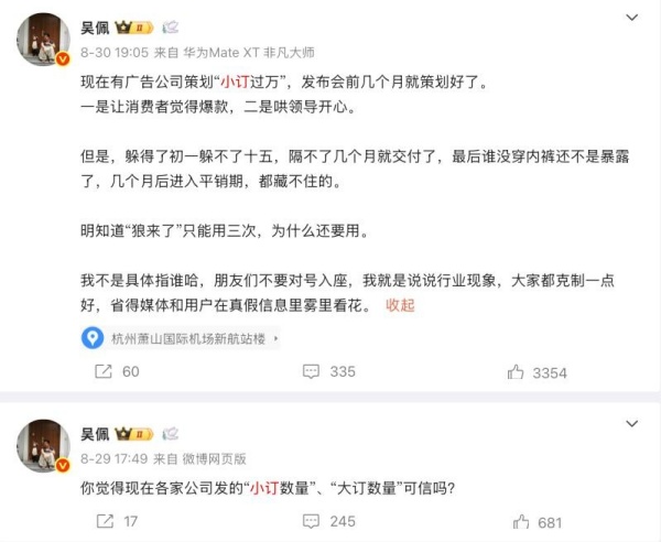 在车企前高管扯下行业遮羞布之余,汽车博主吴佩也曾曝光行业潜规则。他透露,广告公司早在发布会前几个月就策划好“小订过万”,一是让消费者觉得爆款,二是哄领导开心。“但是躲得了初一躲不过十五,隔不了几个月就交付了,最后谁没穿内裤还不是暴露了,几个月后进入平销期,都藏不住的。”