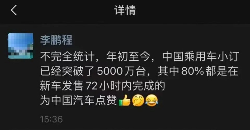 因此,你会看到,车企屡创小订奇迹成为常态。A车企刚创造小订奇迹后,B车企很快便打破纪录,再创销售奇迹。总之,你方唱罢我登场,车圈上演一场又一场围绕小订的军备竞赛。对此,曾在小鹏、阿维塔担任副总裁的李鹏程看不下去了,公开暗讽道,“据不完全统计,年初至今,中国乘用车小订已经突破了5000万辆,其中80%都是在新车发售72小时内完成的。”