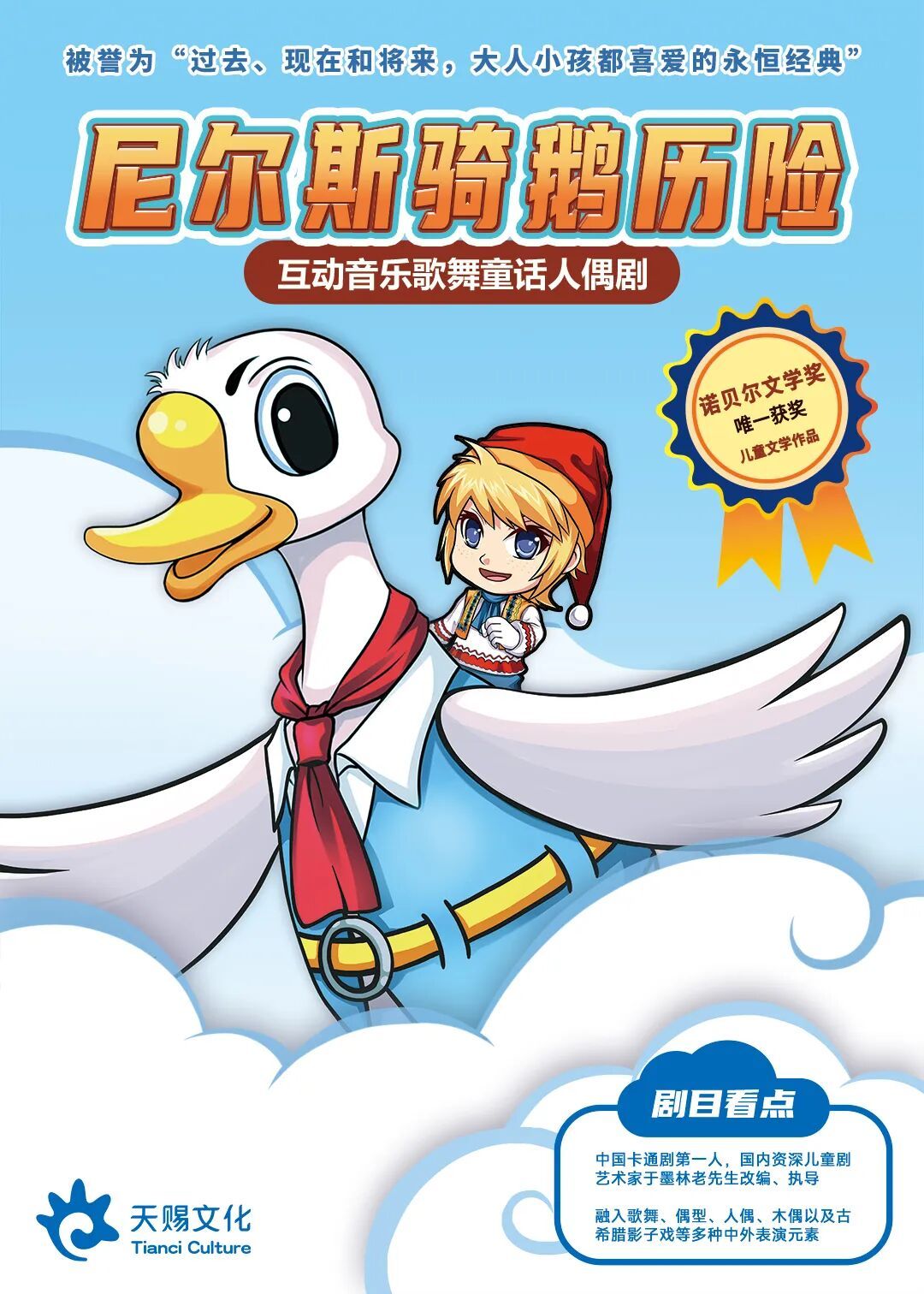 《尼尔斯骑鹅历险》舞台剧以轻松愉快的方式讲述了顽皮孩童尼尔斯经过一系列的冒险和旅行,从一个淘气的小孩渐渐成长为一个善良、理解事理孩子的故事。